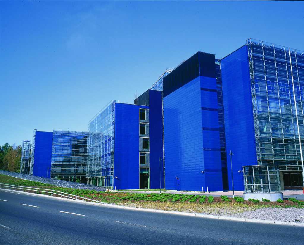 Ilmarinen-huset i Gräsviken, Helsingfors, ritat av Pekka Helin, färdigställdes 2002 – inte en enda emaljpanel har behövt bytas ut. Den krävande blå färgen har förblivit oförändrad i över 20 år – ett bevis på emaljens UV-beständighet och tålighet mot väder, tidens tand, graffiti och den krävande stadsmiljön.