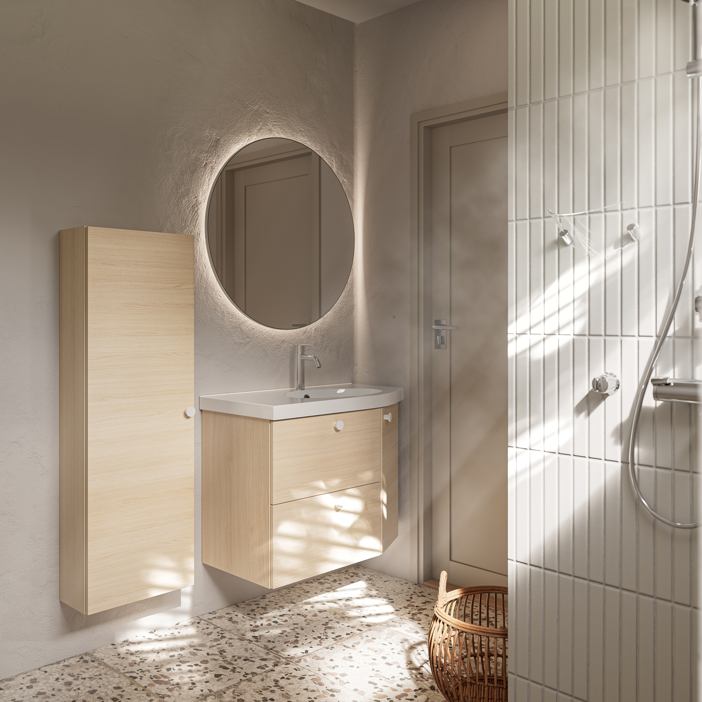 Mondo är särskilt utvecklad för små badrum och gästtoaletter. De avsmalnande hörnen ger extra rörelseutrymme i passagen – en liten detalj som gör stor skillnad.